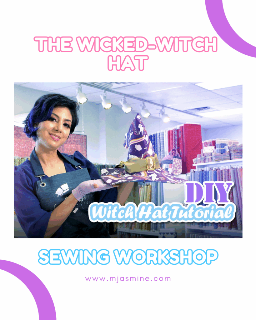 During this class, we learn how to make a Witch Hat at 50% scale from scratch. The students will receive pre-cut pieces of fabric, and access to a free pattern that they can download on PDF at home. This class will cover the following topics: working with stabilizer and cotton fabrics, how to sew circles and curves, the basics of garment making, how to sew inseams, and how to assemble a 3D fabric structure